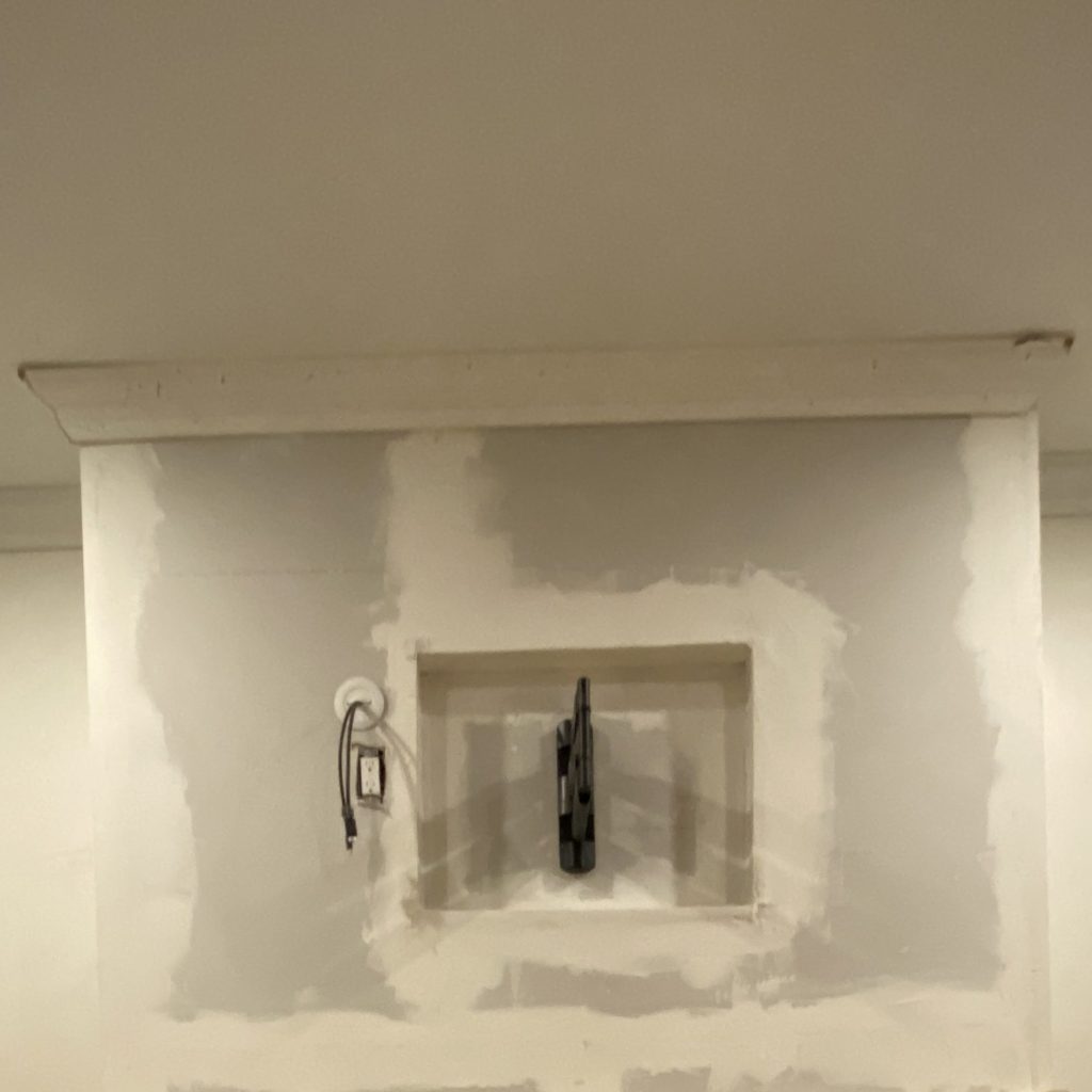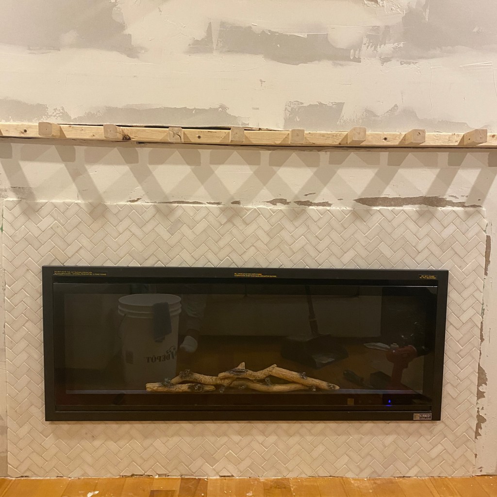 Build mantel frameInstall mantel frameFind tileInstall electrical fireplaceTile fireplace surroundExtend crown molding around fireplace(needs to be fixed still)Frame fireplaceDrywall fireplace- Complete mantel