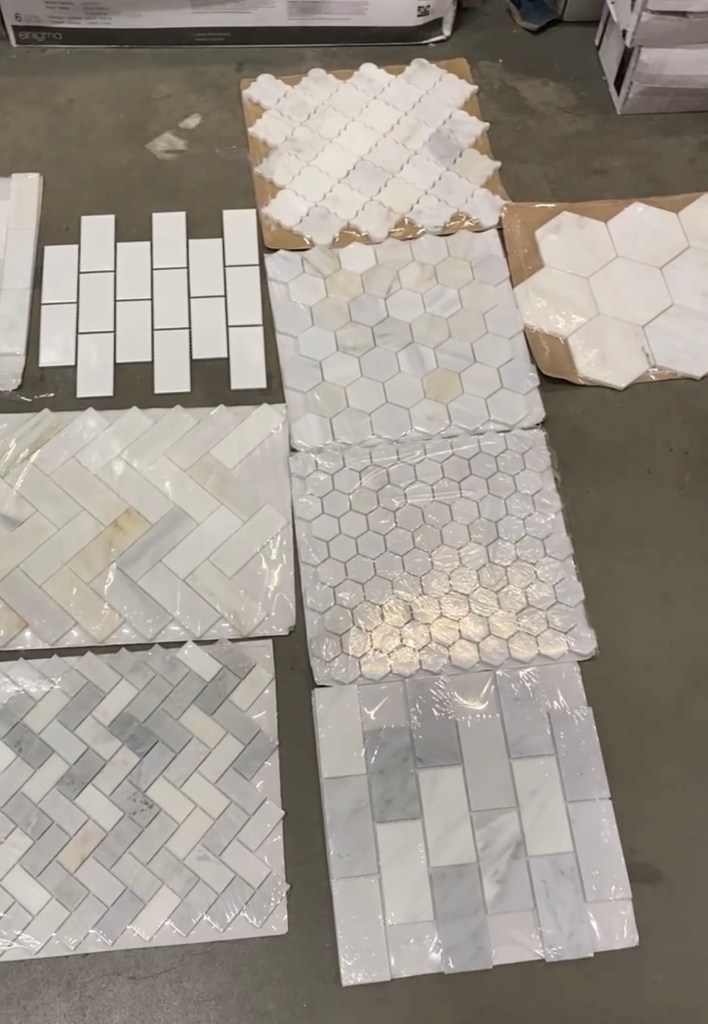 So the hubby and I went on the hunt for the perfect tile, I knew I wanted a white/cream mosaic tile with variation in it and that’s all I knew. I was not set on a particular pattern. We went to two local tile stores and I was utterly unimpressed with their selections, my husband was just unimpressed with the driving around from tile store to tile store (hahaha). Finally we ended up at my tried and true favourite Home Depot (manifesting a future sponsorship) and finally I got all the feels and had tons of options to choose from.